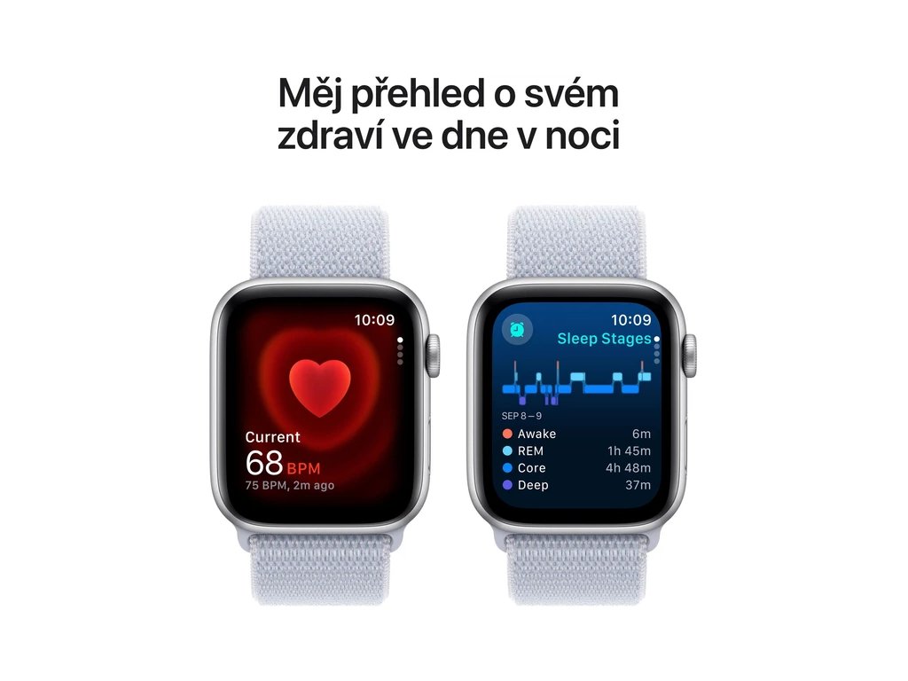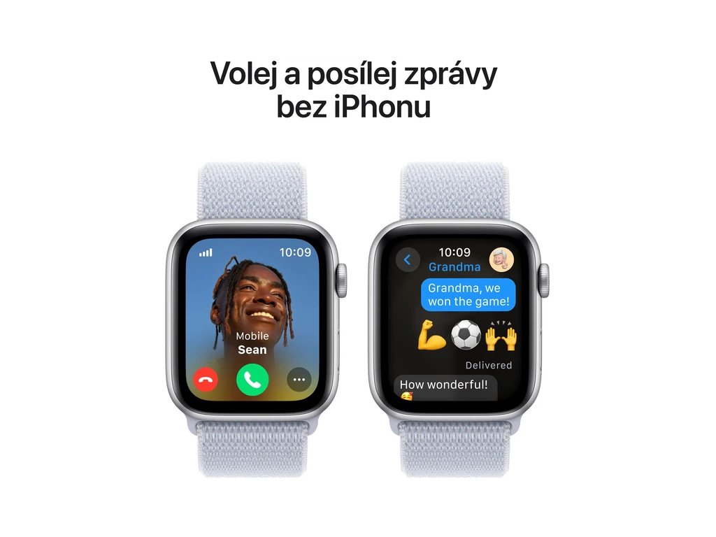 Apple Watch SE (2024) Cellular 44mm Stříbrný hliník s oblačně modrým provlékacím řemínkem
